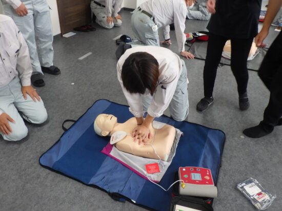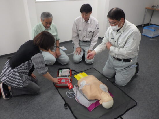 その後はグループに分かれて心肺蘇生・AEDの使い方を実践形式で学びます。